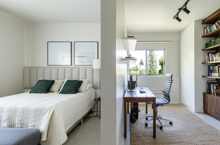 Neste apartamento dos anos 80 o único elemento original preservado foi o piso, a pedido do morador. O layout da área social foi reconfigurado extinguindo a tradicional divisão entre estar e jantar. O sofá modular acompanhado de poltronas leves e pequenas mesas de apoio permitem que o ambiente seja transformado conforme a ocasião, desde um momento íntimo de descanso até uma recepção com amigos. Com uma base de tons claros, o destaque se dá para o verde e para a marcenaria em lâmina de Pau Ferro, e toda a composição é complementada por uma iluminação discreta e aconchegante.